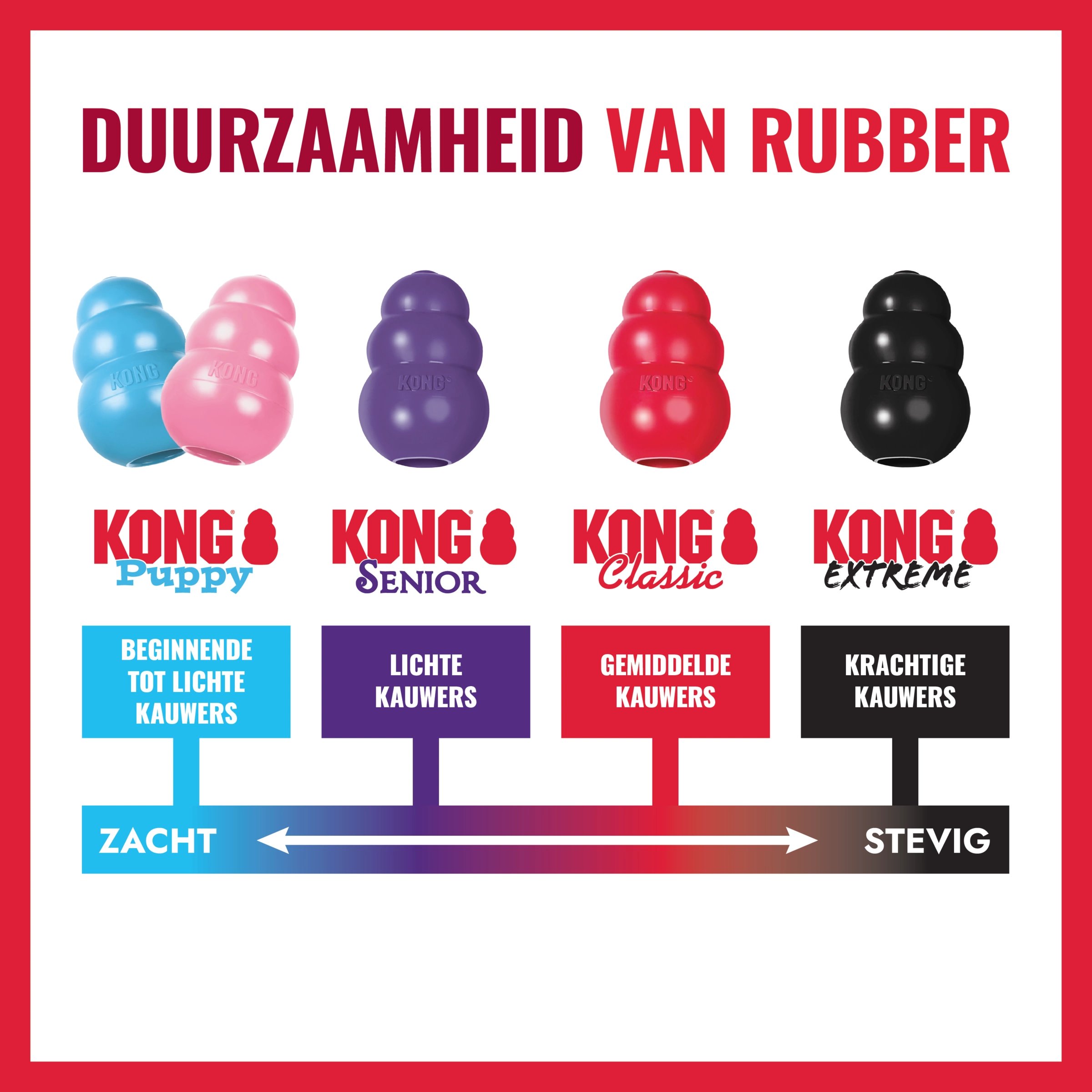 Het KONG Puppy-speeltje is het originele speeltje dat het begin was van de KONG Puppy- productlijn, die gemaakt is van een exclusief rubberen formule voor het doorkomen van het gebit. Dierenartsen en trainers raden aan om de KONG Puppy vol te stoppen met KONG Easy Treat, Snacks of Ziggies voor hulp bij zindelijkheidstraining, het verminderen van scheidingsangst, het bevorderen van correct kauwgedrag en het voorkomen van slecht gedrag.